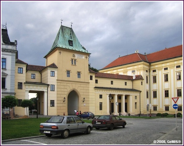Kroměříž: Vstup do arcibiskupského zámku. Zámek a přilehlá zámecká obora je památka zapsaná na seznamu UNESCO.